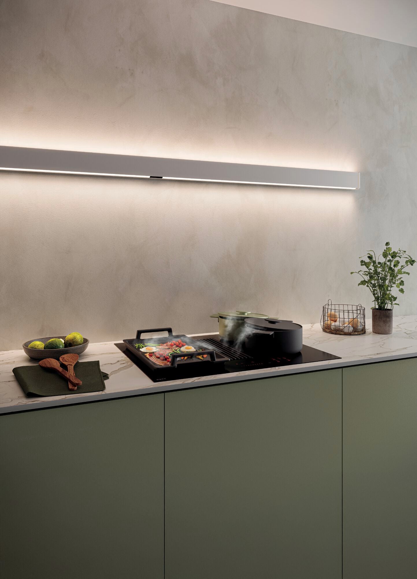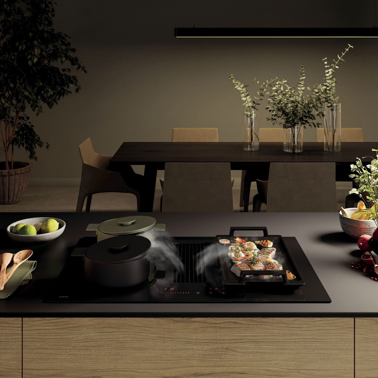 De geïntegreerde afzuiging levert een indrukwekkende afvoercapaciteit van 572 m³ per uur. Damp en geuren worden direct bij de bron weggezogen, nog vóór ze zich kunnen verspreiden – voor een fris en geurvrij kookklimaat. - Fluisterstil in gebruik – slechts 68 dB